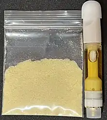 Free base N,N-DMT extracted from Mimosa hostilis root bark (left); vape cartridge made with freebase N,N-DMT extract (right)