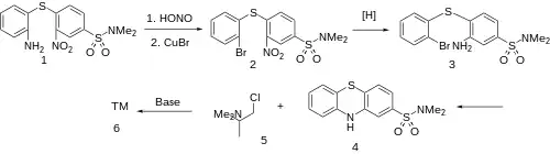 The Sandmeyer reaction on o-(4-Dimethylaminosulfonyl-2-nitrophenylthio)aniline [5510-56-5] (1) gives 4-[(2-Bromophenyl)-thio]-N,N'-dimethyl-3-nitro-benzenesulfonamide [5510-58-7] (2). The reduction of the nitro group gives 3-Amino-4-((2-bromophenyl)thio)-N,N-dimethylbenzenesulfonamide [5592-64-3] (3). Goldberg reaction gives the chief precursor, 2-Dimethylaminosulfonylphenthiazine [1090-78-4] (4). Alkylation of this with 1-chloro-N,N-dimethylpropan-2-amine [53309-35-6] (5) give Dimethothiazine (6).
