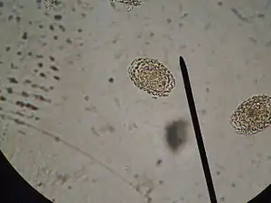 Eggs are 60–80 micrometres x 39–47 micrometres, contain an embryo, and have characteristic sculpturing of the shell.[3] They have an oval-shape and brownish-yellow hue. Eggs have a thick shell, and the surface appears to be pitted except at the poles.