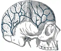 ![]() Veins of the diploë as displayed by the removal of the outer table of the skull. | |