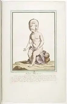 In January 1775, a Spanish family gave birth to a girl with diprosopus. She had 3 eyes (one a combination of 2), 2 noses, 2 mouths, and 3 chins. The child was taken on tour from village to village, and gained much attention in Spain and neighboring countries. Her case is mentioned in Nicolas-François and Geneviève Regnault's Les écarts de la nature, published that year.[19] Her full lifespan is unknown, but is mentioned to still be alive in French publications as late as 1777.