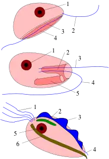 Most excavates are unicellular, heterotrophic flagellates. Only some Euglenozoa are photosynthetic. In some (particularly anaerobic intestinal parasites), the mitochondria have been greatly reduced.[5] Some excavates lack "classical" mitochondria, and are called "amitochondriate", although most retain a mitochondrial organelle in greatly modified form (e.g. a hydrogenosome or mitosome). Among those with mitochondria, the mitochondrial cristae may be tubular, discoidal, or in some cases, laminar. Most excavates have two, four, or more flagella.[4] Many have a conspicuous ventral feeding groove with a characteristic ultrastructure, supported by microtubules—the "excavated" appearance of this groove giving the organisms their name.[3][6] However, various groups that lack these traits are considered to be derived excavates based on genetic evidence (primarily phylogenetic trees of molecular sequences).[6]