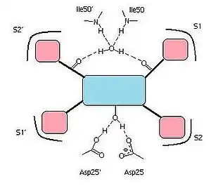 A simplified image of a protease inhibitor binding to the active site of the HIV-1 protease. The central core motif is shown in blue with the hydroxyl group forming hydrogen bonds with Asp-25 and Asp-25´. Hydrogen bonds also connect carbonyl groups on the inhibitor to the water molecule linked to Ile50 and Ile50´. Hydrophobic groups are shown in pink and their complementing pockets referred to as S1, S1´, S2 and S2´.