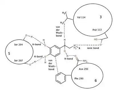 The binding of norephinephrine to the binding site consists of one ionic bond, three hydrogen bonds and van der Waals interaction in two places. Ionic bonding forms between the protonated amine and Asp-113 in helix 3. Hydrogen bonds are formed from the hydroxyl groups, linked to the catechol ring, to Ser-204 and Ser-207 in helix 5. This binding limits configurational and rotational freedom. Van der Waals forces between aromatic catechol ring and Phe-290 in helix 6 residue and Val-114 in helix 3 residue reinforce the binding. It is believed that the N-alkyl substituents fit into a hydrophobic pocket formed between residues in helix 6 and 7. The beta-carbon is chiral and must have the R-configuration so that the beta-hydroxyl group is oriented towards the Asn-293 residue in helix 6 to form a hydrogen bond essential to binding to the beta-2 receptor.[14]