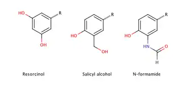 Figure 4 shows the phenyl rings that are used for β2-agonists. They are named resorcinol ring, a salicyl alcohol or an m-formamide group.[14] Figure 5 shows where different substituents on phenylethylamine take places marked as different R-groups.