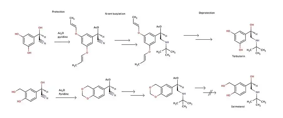 Stereoselective synthesis of tributalin and salbutamol acetal can be done from O-protected-(R)-cyanohydrins. F. Effenberg, et al. describe a way for the synthesis. The main complications are to perform the deprotection step without racemization and to form a pure salt. A Ritter reaction can be used for an N-tertiary butylation. In this experiment deacetylation of (R)-salbutamol acetal was unsuccessful so it can not be used to obtain pure (R)-salbutamol. Figure 6 shows the main steps in the synthesis of salmeterol and tributalin.[22]