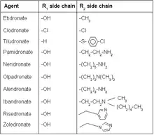Bisphosphonates mimic the endogenous inorganic pyrophosphate where the oxygen backbone is replaced with carbon (P-C-P for P-O-P). The two additional groups or side chains on the carbon backbone are usually referred to as R1 and R2. R1 is usually a hydroxyl group which enhances the affinity for the calcium by forming a tridentate ligand along with the phosphate groups. The compound can be made more potent by optimizing the structure of the R2 group to best inhibit bone resorption.[13]