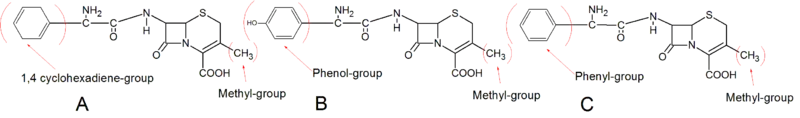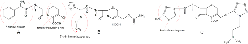 First generation cephalosporins were the first cephalosporins on the market. They have good antimicrobial activity against gram-positive bacteria but limited activity against gram-negative species.[25] The chemical structures of the first generation cephalosporins are fairly simple. As an example three drugs from this class (Cephalexin, Cephradine and Cefadroxil) all have a single methyl group at position C-3. The common side groups at C-3 for first class cephalosporins are small uncharged groups like methyl.[5] The methyl group at position C-3 gives low affinity for common PBP which can in part explain the relatively low activity of these first drugs. Cefaclor however has a Cl group at position C-3 which gives it better binding to PBP and thus better antimicrobial activity. There is not an agreement on classifying Cefaclor as a first generation cephalosporin because of the Cl group at the C-3 position and therefore its improved activity, but it is often classified as such because of its C-7 side chain which is more related to the first generation than the second. All of the first generation cephalosporins have an α-amino group at position C-7. This structure makes them vulnerable to hydrolysis by β-lactamases.[5][9]