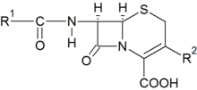 Cephalosporins must get through the bacterial cell wall in order to reach the target PBP. In comparison, it is easier to penetrate the cell wall of gram-positive bacteria than the cell wall of gram-negative bacteria. The cell wall structure of gram-positive bacteria is made routinely up by peptidoglycan which allows the passage of cephalosporin-sized molecules. The cell wall structure of gram-negative bacteria is more complex, composed of polysaccharides, lipids and proteins, and is harder to penetrate. Particles get through the outer membrane through water-filled channels, or porins, which are trans membrane proteins.[15] During exposure to cephalosporins the bacteria can form resistance by itself or as selection of the next generation of bacteria after reproducing itself, by mutation.[16] Bacteria species such as pneumococci and meningococci can acquire exogenous genetic material, and incorporate it into their own chromosomes which leads to antimicrobial resistance.[17] In that manner the target PBP can be altered to have their attraction for cephalosporins and other β-lactam antibiotics lowered.[18][19] The bacteria can also replace the PBP that is vulnerable to Beta-lactam antibiotics with PBP that is less vulnerable.[20] β-lactam antibiotics can be inactivated by many types of β-lactamases, which are produced by bacteria. The enzymes hydrolyze the bond between the carbon and nitrogen atom of the β-lactam ring. There are many beta lactamases which vary in substrate specificity and host range.[21][22] The enzymes active site is easily regenerated hydrolytically so it is re-usable many times, in that way can a comparatively small amount of beta-lactamases destroy a large amount of drug. Gram-positive bacteria, such as a staphylococci, have a high release of beta-lactamases into their extracellular space, where they meet the drug outside the cell wall. Gram-negative bacteria on the other hand follow a more conservative course. They secrete their beta-lactamases into the periplasmic space between the inner and outer membrane so they can't easily escape into the extracellular space, and don't have to be biosynthesized in high quantities.[1]