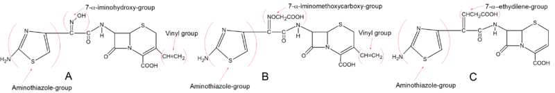 The majority of third generation cephalosporins have the aminothiazole group at position C-7. Different groups are found at the 7-α-position like 7-α-iminohydroxy and 7-α-iminomethoxy. Ceftibuten however possesses a 7-α-ethylidene group. This group gives ceftibuten higher resistance to enhanced spectrum β-lactamases. Many of the oral third generation cephalosporins are esters of parenteral forms and are hydrolysed by esterases in the digestive tract (Cefteram-pivoxil). Some of the third generation drugs can be absorbed orally without the need of esterification. This is for example done with Cefixime and Cefdinir by putting a vinyl group in the C-3 position.[5][9]