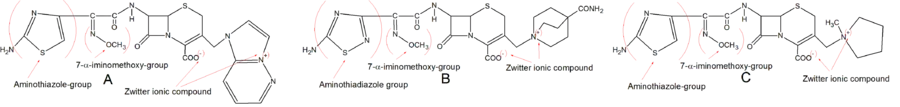 The fourth generation cephalosporins have greater activity against gram-negative bacteria than the second and third generation. This difference is attributed to them being dipolar ionic zwitterion compounds. The C-7 side chain is similar to third generation cephalosporins usually containing iminomethoxy-aminothiazole group or in the case of Cefclidine an aminothiadiazole. Because of the positively charged quaternary nitrogen in the C-3 side chain fourth generation cephalosporins can diffuse through the gram-negative bacterial membrane more readily than earlier cephalosporins. It is thought that the positive charge orients the drug molecule to the entrance of the porin channel.[26]