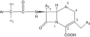The molecular structure of cephalosporin can be altered in various ways to improve in vitro stability, anti-bacterial activity and resistance against β-lactamases. In the acidic conditions of the stomach, in vitro stability can be enhanced by the addition of an amino and a hydrogen to positions α1 and α2 of the cephalosporin structure. This results in a basic compound, an ammonium ion that is protonated in said conditions, giving us a more stable β-lactam which leads to an orally active drug. Anti-bacterial activity can be enhanced if A2 is an alkoxy group instead of a hydrogen. The 7-amino group is crucial for anti-bacterial activity. In some cases, adding a methoxy group in position A2, cephalosporin stability is enhanced toward β-lactamases. In position A1, sulfur and oxygen can be placed in the ring. Sulfur shows better anti-bacterial activity, but oxygen shows better stability towards β-lactamases. In position C6, hydrogen is crucial for biological activity. In position A3, anti-bacterial activity is greater when A3 is a 5-membered heterocycle instead of a 6-membered one. In position α1 and α2, the L-isomer is 30–40 times more stable towards β-lactamase than the D-isomer. Stability toward β-lactamase can be increased around 100-fold with the addition of methoxyoxime. Z-oxime is nearly 20,000-fold more stable than the E-oxime.[1]