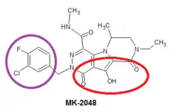 Since there have been problems with resistance to raltegravir and elvitegravir, scientists have started to work on new second generation integrase inhibitors, such as MK-2048 which in 2009 was developed by Merck. It's a prototype second generation INSTI that remains potent against viruses containing mutations against raltegravir and elvitegravir. The mechanism of action and SAR of MK-2048 is the same as of the other INSTIs, the structure of MK-2048 shown in figure 6 with essential pharmacophore highlighted.[23][24]