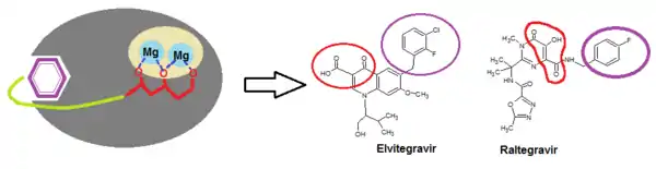 Raltegravir and elvitegravir share the same mechanism of action against integrase: to bind to the active site of Mg2+ ions.[8] Competitive inhibitors compete directly with viral DNA for binding to integrase in order to inhibit 3‘-end processing.[15] In doing this the inhibitors completely block the active site from binding to target DNA. This inhibition is called strand transfer inhibition.[8]
