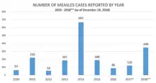 Between January 1 and December 31, 2019, 1,282 cases of measles were confirmed in 31 US states.[14] One case that year was a person who visited Disneyland.[15]