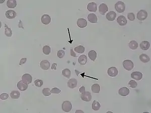 Blood film showing red blood cell fragments (schistocytes)