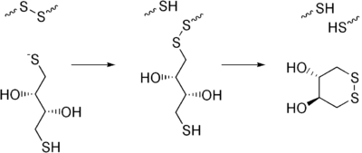 DTT is a reducing agent; once oxidized, it forms a stable six-membered ring with an internal disulfide bond. It has a redox potential of −0.33 V at pH 7.[1] The reduction of a typical disulfide bond proceeds by two sequential thiol-disulfide exchange reactions and is illustrated below. The reduction usually does not stop at the mixed-disulfide species because the second thiol of DTT has a high propensity to close the ring, forming oxidized DTT and leaving behind a reduced disulfide bond. The reducing power of DTT is limited to pH values above 7, since only the negatively charged thiolate form -S− is reactive (the protonated thiol form -SH is not); the pKa of the thiol groups is 9.2 and 10.1.