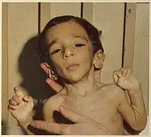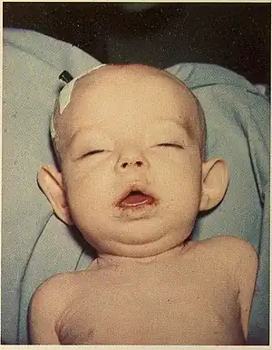 Facial features indicative of Donohue syndrome include protuberant and low-set ears, flaring nostrils, unusually large mouth, thick lips, and widely spaced eyes. Physical features include stunted growth (including during gestation), lack of subcutaneous adipose tissue, muscle atrophy, hirsutism (excessive body hair growth), and dysplasia (nail malformation).[2] Additionally, a condition known as acanthosis nigricans is present in affected individuals. In acanthosis nigricans, patches of skin darken and thicken to gain a velvet-like appearance. Gender specific features also include enlarged clitoris and breasts, as well as ovarian cysts in affected females, and enlarged penis in affected males.[2] In the Journal of Pediatric Medicine, Donohue and Uchida described affected sisters whose growth appeared to have ended in the seventh month of gestation, both born alive but dying before four months of age.[3] Very early death (or spontaneous abortion) is typical, although affected individuals sometimes live longer than a decade.[3]