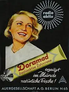 Doramad Radioactive Toothpaste (Doramad Radioaktive Zahncreme) was a brand of toothpaste produced in Germany by Auergesellschaft of Berlin from the 1920s through World War II.[1] It was known for containing thorium, a radioactive metal, and is an example of radioactive quackery.