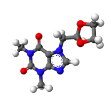 Doxofylline (also known as doxophylline) is a phosphodiesterase inhibiting bronchodilator used in the treatment of chronic respiratory diseases such as asthma[1] and COPD.[2] Like theophylline, it is a xanthine derivative.[3][4]