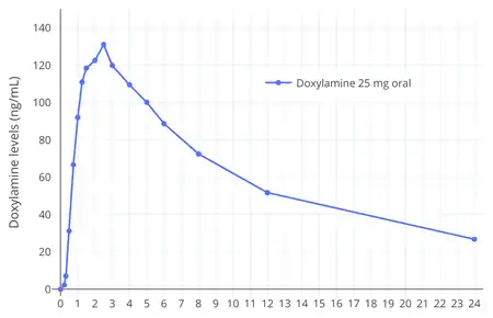 The bioavailability of doxylamine is 24.7% for oral administration and 70.8% for intranasal administration.[1] The Tmax of doxylamine is 1.5 to 2.5 hours.[2] Its elimination half-life is 10 to 12 hours (range 7 to 15 hours).[2][3][4] Doxylamine is metabolized in the liver primarily by the cytochrome P450 enzymes CYP2D6, CYP1A2, and CYP2C9.[2][40] The main metabolites are N-desmethyldoxylamine, N,N-didesmethyldoxylamine, and doxylamine N-oxide.[41] Doxylamine is eliminated 60% in the urine and 40% in feces.[5]