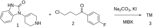 The alkylation between 1-(1,2,3,6-tetrahydro-4-pyridyl)-2-benzimidazolinone [2147-83-3] (1) and 4-chloro-4'-fluorobutyrophenone [3874-54-2] (2) gives Droperidol (3).