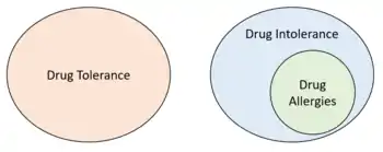 Drug intolerance or drug sensitivity refers to an inability to tolerate the adverse effects of a medication, generally at therapeutic or subtherapeutic doses. Conversely, a patient is said to be "tolerating" a drug when they can tolerate its adverse effects. Some instances of drug intolerance are known to result from genetic variations in drug metabolism.