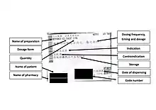 Drug labelling is also referred to as prescription labelling, is a written, printed or graphic matter upon any drugs or any of its container, or accompanying such a drug. Drug labels seek to identify drug contents and to state specific instructions or warnings for administration, storage and disposal. Since 1800s, legislation has been advocated to stipulate the formats of drug labelling due to the demand for an equitable trading platform, the need of identification of toxins and the awareness of public health. Variations in healthcare system, drug incidents and commercial utilization may attribute to different regional or national drug label requirements. Despite the advancement in drug labelling, medication errors are partly associated with undesirable drug label formatting.