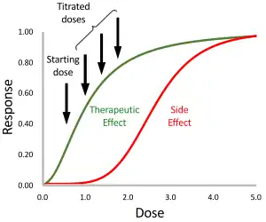 When a drug has a narrow therapeutic index, titration is especially important, because the range between the dose at which a drug is effective and the dose at which side effects occur is small.[2] Some examples of the types of drugs commonly requiring titration include insulin, anticonvulsants, blood thinners, anti-depressants, stimulants for ADHD and sedatives.[3][4][5]