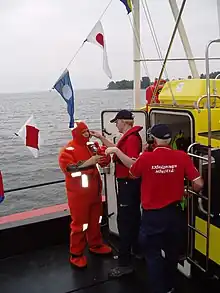 - Survival suit – Waterproof suit that protects the wearer from hypothermia from immersion in cold water