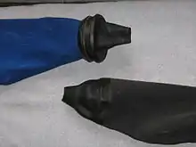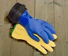Neoprene wetsuit gloves are pulled over the top of wrist seals. They are wet gloves and vary considerably in effectiveness depending on construction and fit. As they are not watertight they do not fail catastrophically when damaged, and are reasonably tough.[8]