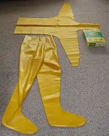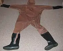 A dry suit or drysuit provides the wearer with environmental protection by way of thermal insulation and exclusion of water,[2][3][4][5] and is worn by divers, boaters, water sports enthusiasts, and others who work or play in or near cold or contaminated water. A dry suit normally protects the whole body except the head, hands, and possibly the feet. In hazmat configurations, however, all of these are covered as well.[6]
