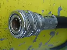 There are two types of low-pressure hose connections commonly used for suit inflation. These are the standard Seatec style quick release coupler, fitted with an internal Schrader valve, as also used on most diving buoyancy compensators, and the CEJN connector which allows a higher flow rate due to a larger bore through the non-return valve in the connector. This valve can allow a dangerously fast inflation rate if it jams open, and is also more likely to free-flow when disconnected. These hose connectors use incompatible valve fittings, but it is usually possible to swap the fitting on the inflator valve to accept the alternative hose end fitting. Both types of BCD and dry suit low pressure inflator hoses are supplied with a standard fitting for connection to a scuba regulator first stage low-pressure port.[28][1]: Ch5