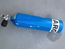 Compensating gas is supplied from a breathing gas cylinder, a small, dedicated suit inflation cylinder, or the umbilical of a surface-supplied diver. Normally, the gas used for dry suit inflation on scuba is air from the primary breathing cylinder. Helium-based gas mixes such as trimix or heliox are avoided for suit inflation because of helium's high thermal conductivity.[24] Nitrox blends from a decompression cylinder have essentially the same thermal conductivity as air but oxygen rich mixes introduce a fire hazard when out of the water. Using a small (1-2 litre), dedicated cylinder for suit inflation avoids these complications; usually this will contain air but argon may be used instead. Argon has a low thermal conductivity, which improves insulation by approximately 20% compared to air,[1]: 24 [25][8] without adding any bulk or weight. However, the accidental breathing of pure argon results in rapid unconsciousness and probable death. Consequently, argon cylinders must be clearly marked to prevent the accidental attachment of a breathing regulator or have valves that cannot accept a breathing regulator. To gain the full benefit of argon the suit must be flushed with argon before the dive to remove the air.[26][27]