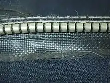 Before truly watertight zippers were invented, other methods of keeping the suit waterproof at the entry point were used, with the most common being a long rubber tunnel entry on the chest or the back, which would be folded shut, then rolled together from the sides and finally folded and clamped with a metal clip or tied with surgical rubber tubing. Sometimes the entry tunnel protruded through a non-watertight zipper, which would be closed over it to hold the roll in place in the pocket so formed.[1]: 14