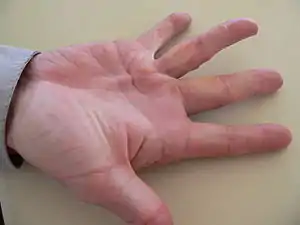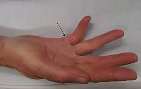 Typically, Dupuytren's contracture first presents as a thickening or nodule in the palm, which initially can be with or without pain.[10] Later in the disease process, which can be years later,[11] there is painless increasing loss of range of motion of the affected finger(s). The earliest sign of a contracture is a triangular "puckering" of the skin of the palm as it passes over the flexor tendon just before the flexor crease of the finger, at the metacarpophalangeal (MCP) joint.
