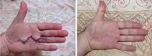 The graft is sutured to the skin surrounding the wound. For one week the hand is protected with a dressing. The hand and arm are elevated with a sling. The dressing is then removed and careful mobilization can be started, gradually increasing in intensity.[47] After this procedure the risk of recurrence is minimised,[37][47][48] but Dupuytren's can recur in the skin graft[49] and complications from surgery may occur.[50]