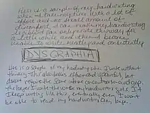 It is also suggested by Berninger that teachers with dysgraphic students decide if their focus will be on manuscript writing (printing) or keyboarding. In either case, it is beneficial that students are taught how to read cursive writing as it is used daily in classrooms by some teachers.[4] It may also be beneficial for the teacher to come up with other methods of assessing a child's knowledge other than written tests; an example would be oral testing. This causes less frustration for the child as they are able to get their knowledge across to the teacher without worrying about how to write their thoughts.[13] Dysgraphic students may benefit from special accommodation by their teachers when being required to write. Accommodations that may be helpful include but are not limited to; offering larger pencils or pencils with special grips, supplying paper with raised lines to provide tactile feedback, allowing extra time for classwork assignments, scaling down large written assignments and breaking down long written assignments into multiple shorter assignments.[20]