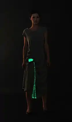 In 1968, the Museum of Contemporary Craft in New York City held a ground-breaking exhibition called Body Covering that focused on the relationship between technology and apparel. The show featured astronauts' space suits along with clothing that could inflate and deflate, light up, and heat and cool itself.[9] Particularly noteworthy in this collection was the work of Diana Dew,[10] a designer who created a line of electronic fashion, including electroluminescent party dresses and belts that could sound alarm sirens.[11]