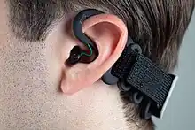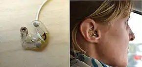 ![]() Examples of in-ear EEG mounts. On the left is seen a single earplug (right ear), on the right is seen a right earplug in ear | |