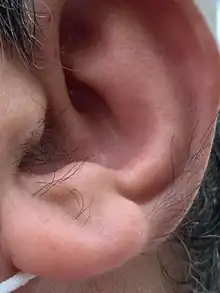 Ear hair is the terminal hair arising from folliculary cartilage inside the external auditory meatus in humans.[1] In its broader sense, ear hair may also include the fine vellus hair covering much of the ear, particularly at the prominent parts of the anterior ear, or even the abnormal hair growth as seen in hypertrichosis and hirsutism. Medical research on the function of ear hair is currently very scarce.