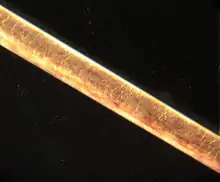 Hair is a protein filament that grows from follicles in the dermis, or skin. With the exception of areas of glabrous skin, the human body is covered in follicles which produce thick terminal and fine vellus hair. It is an important biomaterial primarily composed of protein, notably keratin.