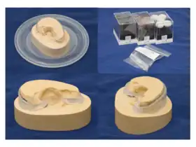 The first stage involves taking an impression of the reconstructed auricle with Soft Putty Elastomer, which is cast in dental stone to make a model of the reconstructed auricle. The splint is made by thermoforming a 4mm sheet of transparent ethylene-vinyl acetate (EVA) over the stone model. The edges of the splint are trimmed and polished using the outline on the model as a guide.[2][9]