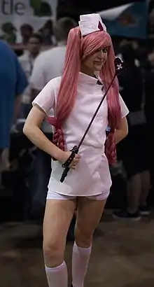 Ebola-chan is an anime anthropomorphization of the Ebola virus. The character has a long pink hair that curls in the characteristic shape of Ebola.[5] Ebola-chan has been described as being caucasian-stylized.[12][6] Ebola-chan was often depicted wearing a nurse outfit and holding a bloodied-skull.[5] Some depictions of the character include small purple demon wings and a happy disposition. Oftentime, the character would be depicted in a sexualized manner, alongside a lesbian partner.[6]