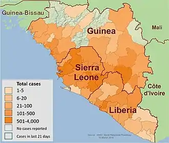 An Ebola virus epidemic in Sierra Leone occurred in 2014, along with the neighbouring countries of Guinea and Liberia. On 18 March 2014, Guinean health officials announced the outbreak of a mysterious hemorrhagic fever "which strikes like lightning".[2] It was identified as Ebola virus disease and spread to Sierra Leone by May 2014.[3] The disease was thought to have originated when a child from a bat-hunting family contracted the disease in Guinea in December 2013.[4]
