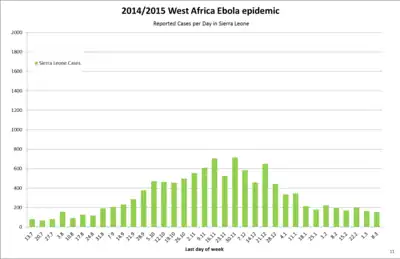By 2 October 2014, an estimated 5 people per hour were being infected with the Ebola virus in Sierra Leone.[62] By this time it was estimated the number of infected had been doubling every 20 days.[63] On 4 October, Sierra Leone recorded 121 fatalities, the largest number in a single day.[64] On 8 October, Sierra Leone burial crews went on strike.[65] On 12 October, it was reported that the UK would begin providing military support to Sierra Leone in addition to a major UK civilian operation in support of the Government of Sierra Leone.[66]