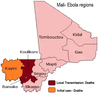 On 23 October 2014, the first case of Ebola virus disease in Mali was confirmed in the city of Kayes—a two-year-old girl who had arrived with a family group from Guinea, and died the next day.[223][224] Her father had worked for the Red Cross in Guinea and also in a private health clinic; he had died earlier in the month, likely from an Ebola infection contracted in the private clinic. It was later established that a number of family members had also died of Ebola. The family had returned to Mali after the father's funeral via public bus and taxi—a journey of more than 1,200 kilometres (750 mi). All contacts were followed for 21 days, with no further spread of the disease reported.[225]
