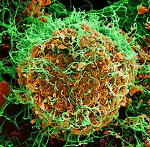 The genus Ebolavirus (/iˈboʊlə/- or /əˈboʊləˌvaɪrəs/; ee-BOH-lə- or ə-BOH-lə-VY-rəs)[1][2][3] is a virological taxon included in the family Filoviridae (filament-shaped viruses), order Mononegavirales.[3] The members of this genus are called ebolaviruses,[3] and encode their genome in the form of single-stranded negative-sense RNA.[4] The six known virus species are named for the region where each was originally identified: Bundibugyo ebolavirus, Reston ebolavirus, Sudan ebolavirus, Taï Forest ebolavirus (originally Côte d'Ivoire ebolavirus), Zaire ebolavirus, and Bombali ebolavirus. The last is the most recent species to be named and was isolated from Angolan free-tailed bats in Sierra Leone.[5] Each species of the genus Ebolavirus has one member virus, and four of these cause Ebola virus disease (EVD) in humans, a type of hemorrhagic fever having a very high case fatality rate. The Reston virus has caused EVD in other primates.[6][7] Zaire ebolavirus has the highest mortality rate of the ebolaviruses and is responsible for the largest number of outbreaks of the six known species of the genus, including the 1976 Zaire outbreak and the outbreak with the most deaths (2014).[8]