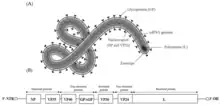 Ebolavirus is a filamentous, enveloped virus within the order Mononegavirales which also contains rabies and measles viruses.[15] This order is characterized by non-segmented, single-stranded negative-sense RNA (-ssRNA) genomes that are surrounded by a helical nucleocapsid.[16] Filoviruses encode seven different proteins that include: NP (nucleoprotein), VP35 (part of the polymerase complex), VP40 (matrix protein), GP (glycoprotein spike), VP30 (transcription activator), VP42 (second matrix protein), and L (RdRp).[17] Of these proteins, GP and NP proteins are crucial for viral entry and replication.[17]