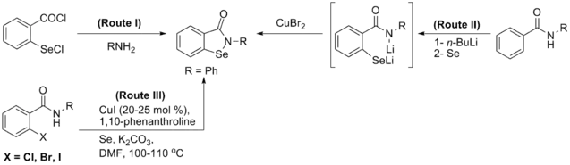 - Balkrishna SJ, Bhakuni BS, Chopra D, Kumar S (December 2010). "Cu-catalyzed efficient synthetic methodology for ebselen and related Se-N heterocycles". Organic Letters. 12 (23): 5394–7. doi:10.1021/ol102027j. PMID 21053969.